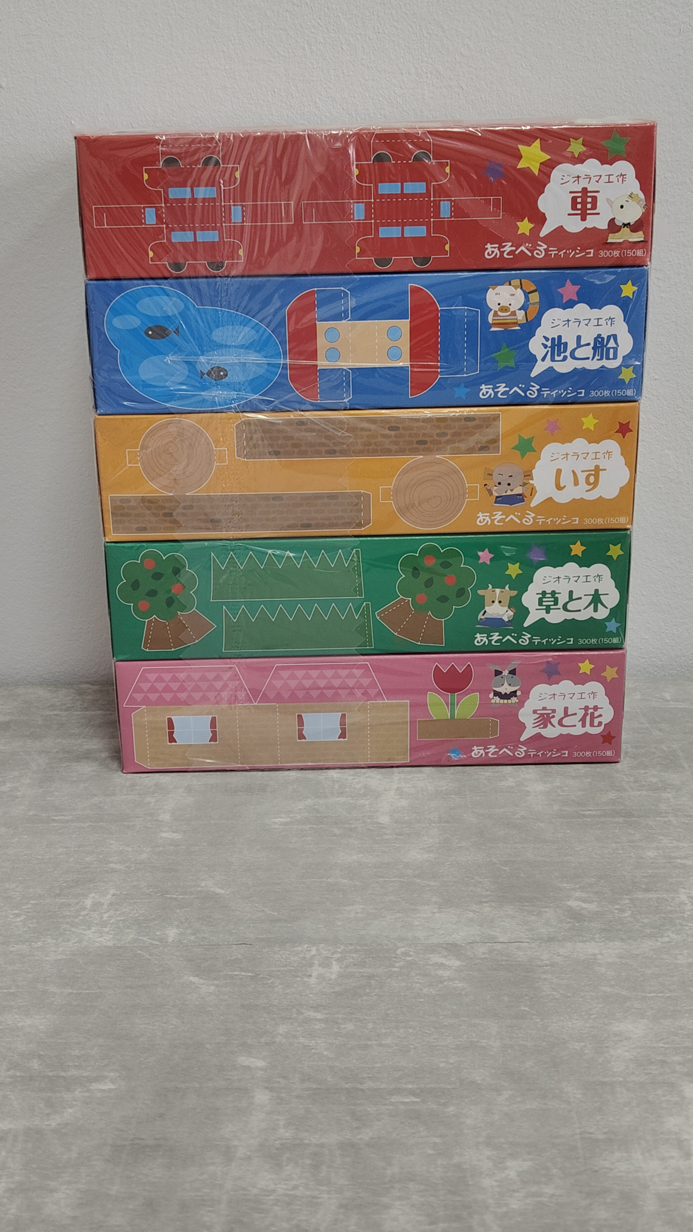 Ideshigyo Двухслойные бумажные салфетки "Asoberu" (с коробкой для вырезания миниатюр животных и горы Фудзи), 150 шт. х 5 пачек / 12