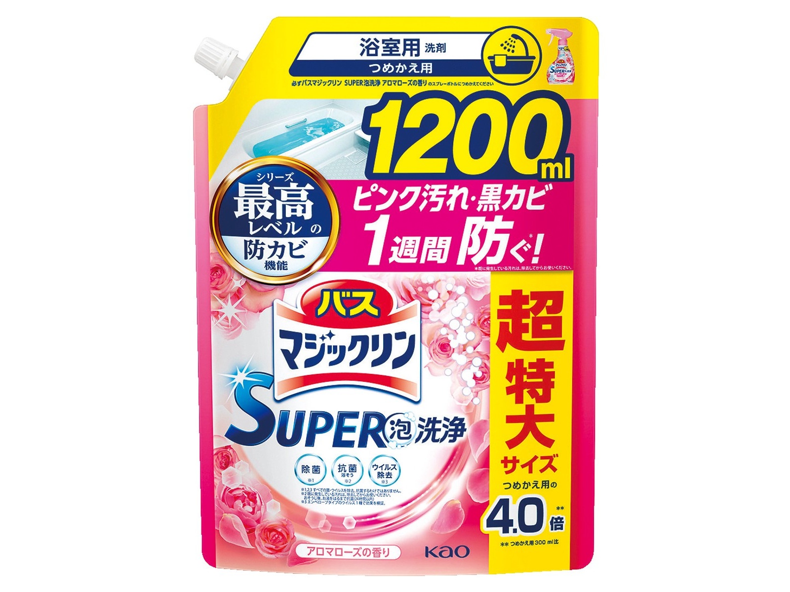 KAO Жидкость чистящая для ванны "Magiсclean" (предотвращающая образование розовой и чёрной плесени, с антибактериальным эффектом, аромат розы), мягкая упаковка с крышкой 1200 мл