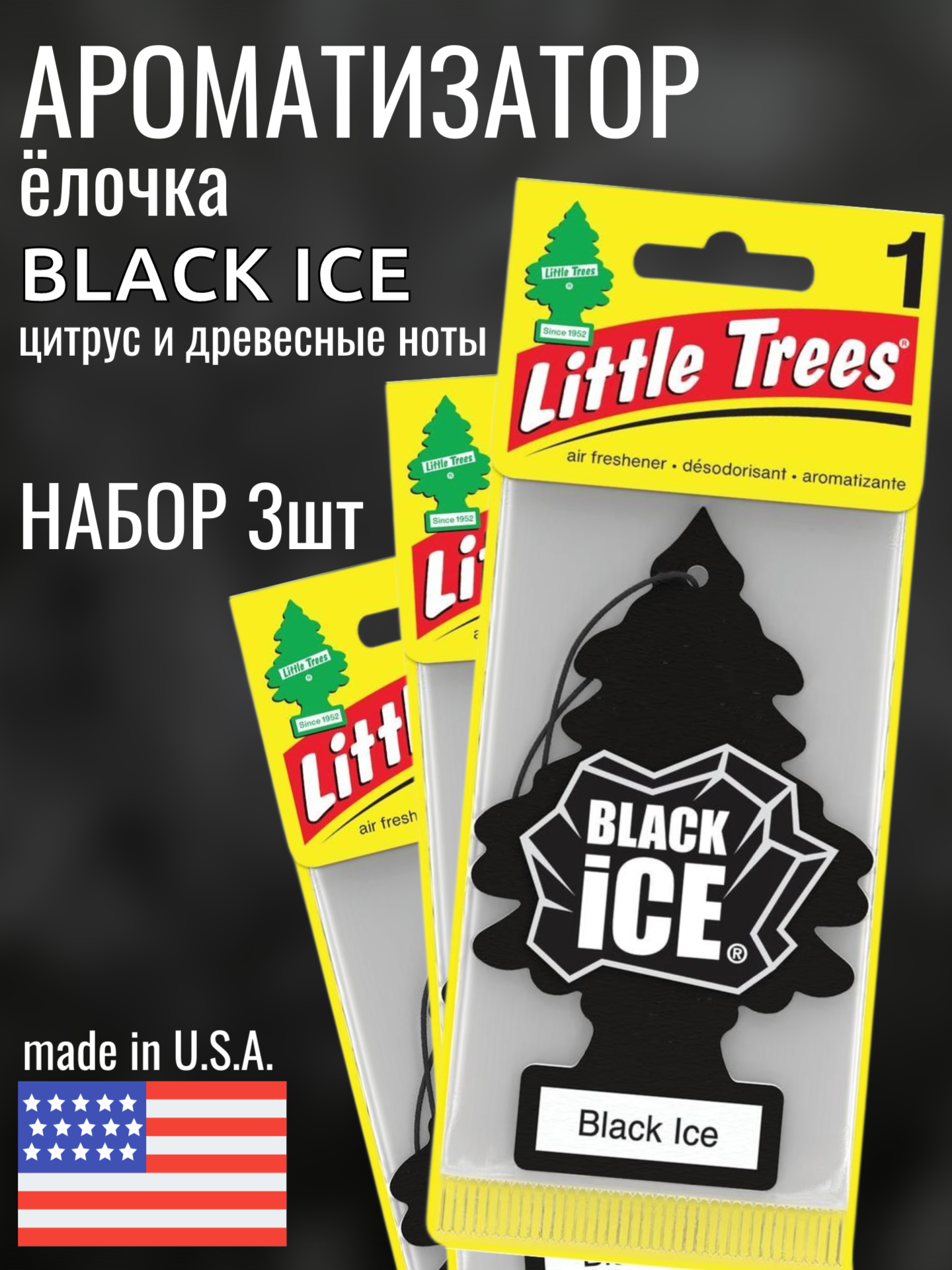 НАБОР LITTLE TREES Ароматизатор Ёлочка "Черный лед" (Black Ice) 3шт
