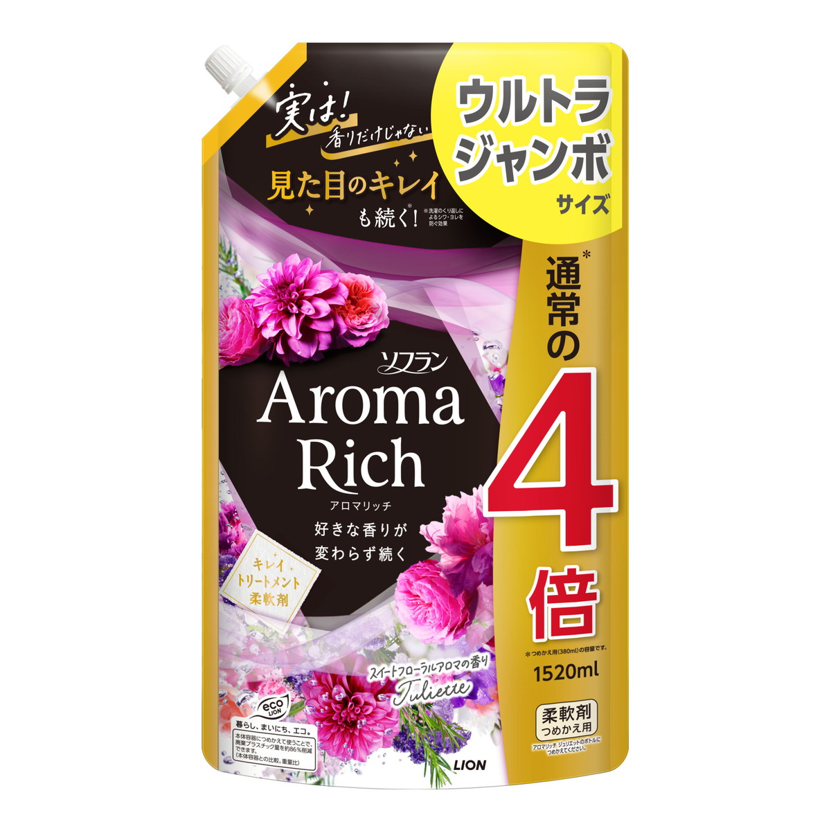 LION Кондиционер для белья "Джульетт" (формула сохранения неизменного аромата и красоты тканей / с натуральными маслами "Aroma Rich Juliette 814") 1520 мл, мягкая упаковка с крышкой